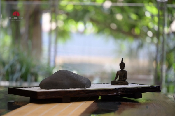 Tiểu cảnh nhỏ để bàn trà với tượng Phật kết hợp với khối đá Bazan mồ côi tự nhiên hoàn toàn. Đá mồ côi là loại đá không có dính vào một thân chính, không phải cắt ra từ một mỏm đá, mà nó trôi dạt trong sông suối ao hồ lâu năm. Đây là loại đá mồ côi da lê thân nó đều đặn và hơi sần như quả lê ...xuất xứ từ Khánh Hòa