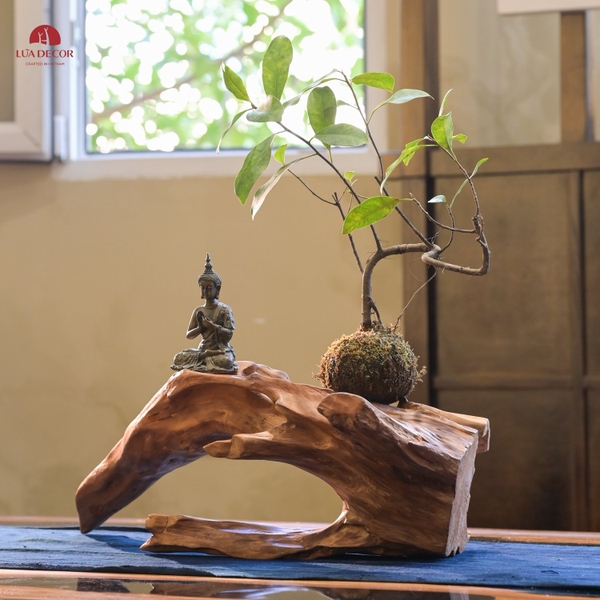 Phối hợp với cây ngọc rêu si bonsai được trồng theo phương pháp kokedama - một cách trồng cây bonsai không cần chậu kiểu Nhật - và một tượng an nhiên bằng composit và bột thạch anh made in vietnam