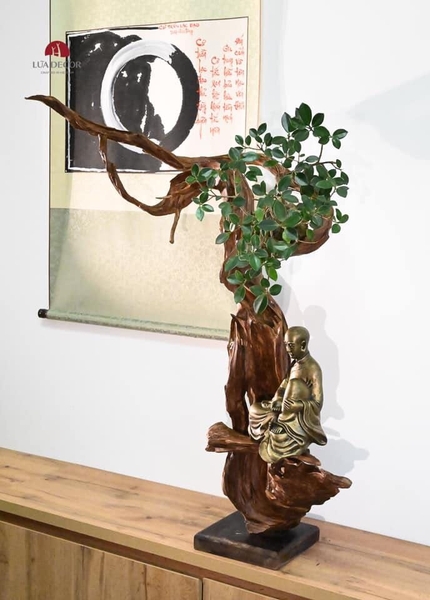 Cây ngọc rêu - kokedama Tác phẩm sắp đặt tiểu cảnh thiền này là một tổng thể hài hòa của 3 yếu tố: sự vững chãi, tĩnh tại và năng lượng tích cực từ thiên nhiên trên khối lũa độc bản cùng sức sống và mầm xanh từ tinh cầu ngọc rêu sống động. Những góc xanh an yên này được cân bằng bởi yếu tố thứ 3 là pho tượng Phật được thiết kế riêng cho từng không gian sống và làm việc để bạn đạt tới nghệ thuật sống thời đại: sự bình yên nội tại của tâm hồn, tâm tĩnh để nhìn xa hơn, thư thái và sáng suốt hơn trong công việc và cuộc sống. Những giá trị trường tồn của thiên nhiên gửi gắm trong từng tác phẩm của LŨA DECOR đang chờ duyên để đến với mỗi không gian sống của bạn với tinh thần hài hoà với thiên nhiên trong từng thiết kế, nhằm mang lai không gian sống nghệ thuật hơn, sự cân bằng phong thủy từ chất liệu gỗ, thêm nhiều năng lượng tích cực và an yên cho mọi không gian sống. Có thể gọi Ngọc rêu (Kokedama) là quả cầu sống, một cách trồng cây của người Nhật, bằng cách dùng một quả bóng đất và rêu để trồng cây theo một công thức đặc biệt nuôi cây đến 2 năm mà mỗi tuần chỉ cần “tưới” nước 1 lần vì là “nhà máy điều hoà độ ẩm” để giữ khi thừa nước và nhả khi thiếu nước. Sức sống xanh từ chính rêu và những mầm cây xinh xắn mọc lên mỗi ngày sẽ là một tinh cầu sống động cho không gian sống của bạn. Thông tin về gỗ lũa: Lũa là phần lõi gỗ còn lại sau nhiều năm chôn vùi trong lòng đất, sông suối của các loại cây cổ thụ lâu năm quý, hiếm như nghiến, đinh hương, lim, sến, táu… . Chính vì sự quý hiếm, độ bền và thời gian dài tích tụ năng lượng của thiên nhiên hoang dã mà gỗ lũa có giá trị cao về thẩm mỹ và phong thuỷ. Vì vậy các nghệ nhân của LŨA DECOR đã dành rất nhiều thời gian và công sức để sáng tạo ra những sản phẩm gỗ lũa nghệ thuật độc bản, đánh thức sự sống và vẻ đẹp cho các khối gỗ không còn giá trị xanh. LŨA DECOR – A N E W J O U R N E Y F R O M T H E E N D ——————- LŨA DECOR 217A Trường Chinh - Thanh Xuân, Hà Nội Hot line: 0966369369 (viber/zalo/whatapp) Follow us: www.instagram.com/luadecor.vn http://www.luadecor.vn