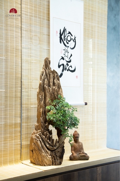 Ngoài ra bạn có thể dùng khối lũa kết hợp với hoa cho không gian thêm mới mẻ.
