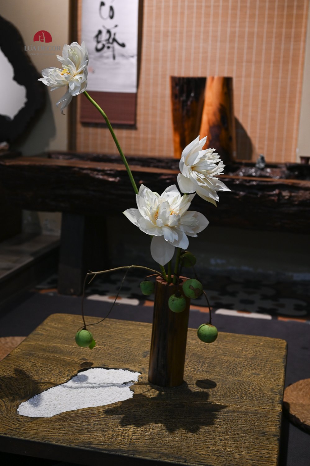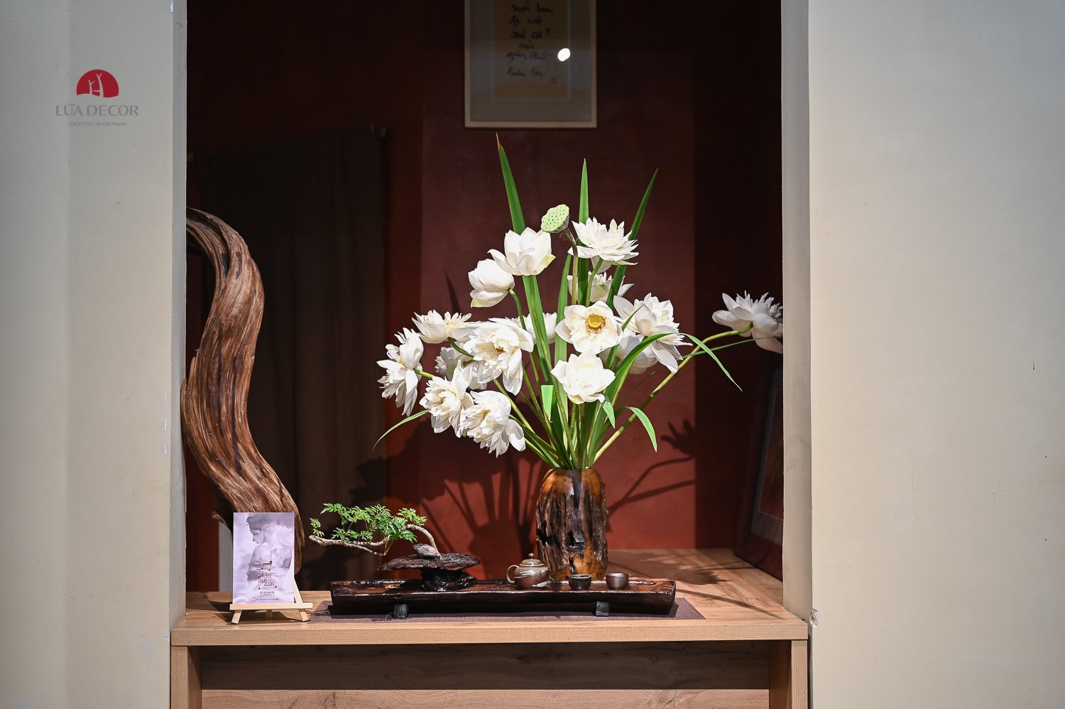 Sự kết hợp độc đáo và tinh tế của hoa sen với chất liệu gỗ lũa được nghệ nhân Ikebana Nguyễn Thanh Hiền thể hiện tại không gian Lũa Decor đã càng làm tôn lên giá trị của hoa Sen với nghệ thuật độc đáo.